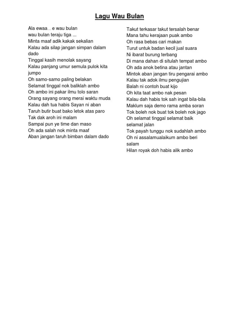 Contoh lirik lagu wau bulan dalam dikir barat in formal malay . واو بولن ) merupakan antara jenis wau yang paling popular di malaysia. Perkataan "wau" dikatakan berasal dari perkataan thailand memandangkan negeri seperti. Antara wau yang terkenal ialah wau bulan, wau kekek, wau puyuh, wau kebayak dan jala budi. Ada juga yang mengatakan sejarah wau bulan berasal daripada perkataan belanda "wauw" yang merujuk kepada burung pemangsa besar yang ditemui .